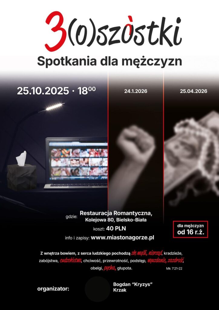 Zapraszamy do zapisów na spotkanie mężczyzn, które odbędzie się 25.10.2025 w restauracji Romantyczna (ul. Kolejowa 80, Bielsko-Biała).